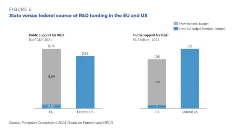 According to Draghi, “Public R&D spending in the EU is highly fragmented across Member States, not consistently directed towards EU-wide priorities, and often difficult to access. In the US, the vast majority of public R&D spending comes from the federal budget. In the EU, it largely comes from the budgets of the 27 Member States, complemented by a smaller amount of EU-level resources. R&D spending at the EU level mostly comes from Horizon Europe, the EU’s Framework Programme for R&I. Other EU-level resources come from the structural and cohesion funds and the European Defence Fund. All the EU-level funding of public R&D accounts for around one-tenth of the overall public spending on R&D in the Union.”